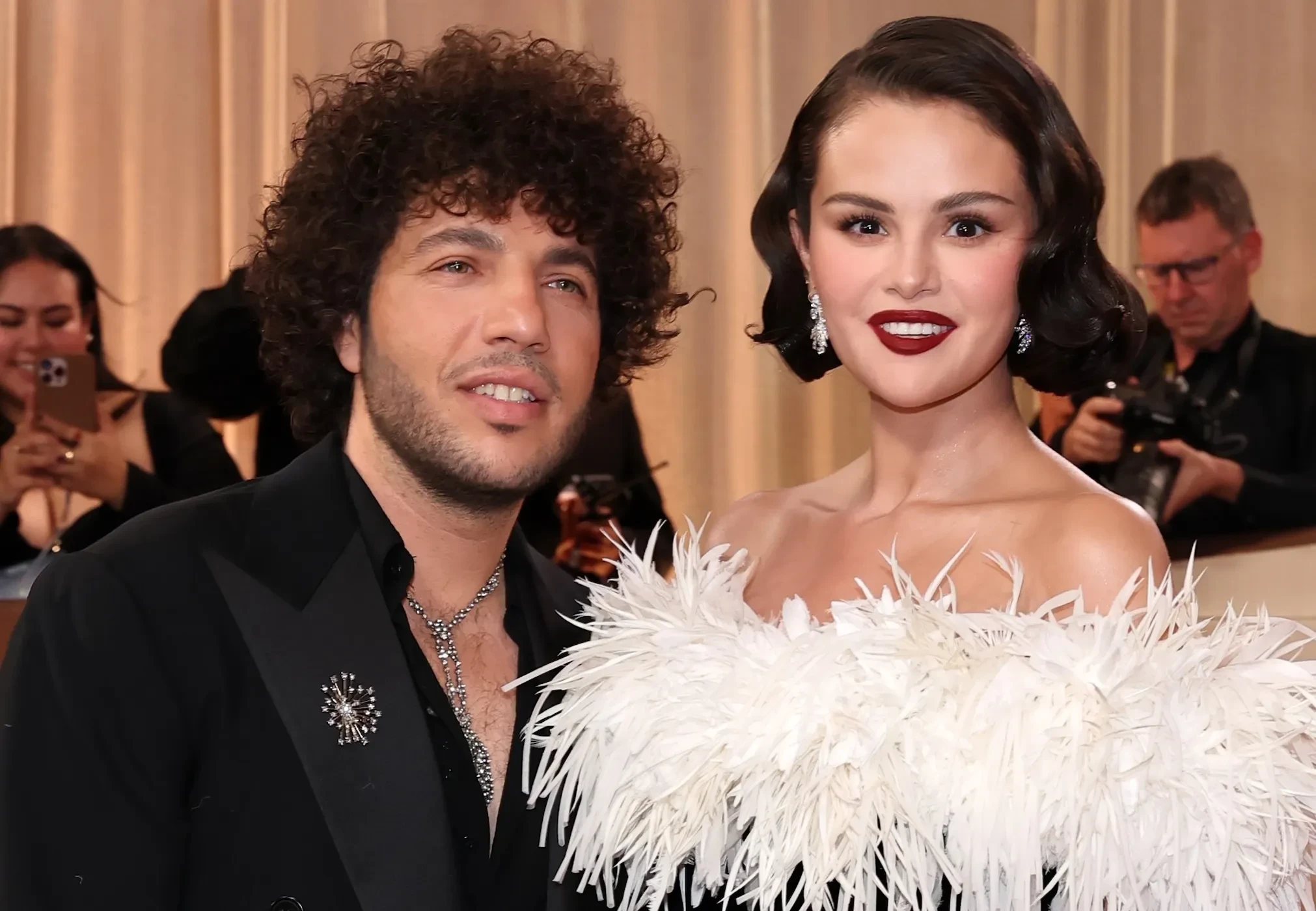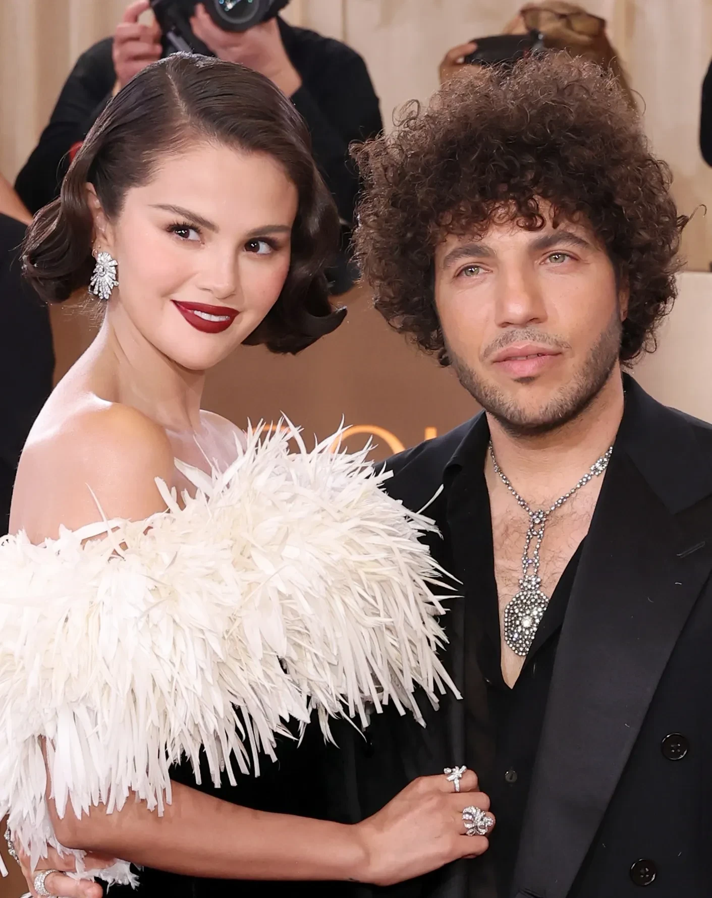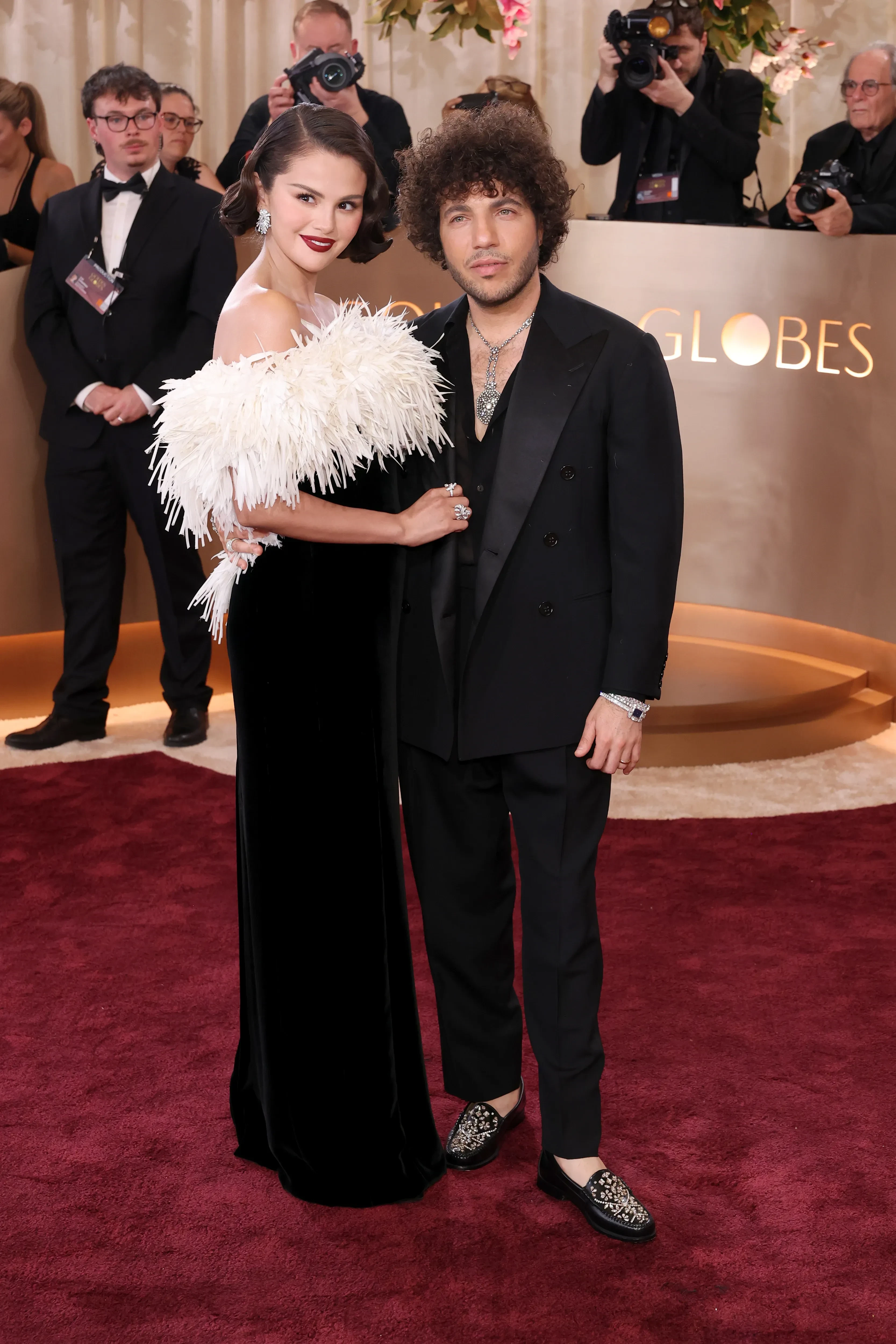 33-летняя Селена Гомес вышла на дорожку в образе старого Голливуда: она позировала в чёрном платье Chanel с перьями, дополнив образ тёмной помадой и ювелирными украшениями. 37-летний продюсер Бенни Бланко надел чёрный костюм и мокасины.