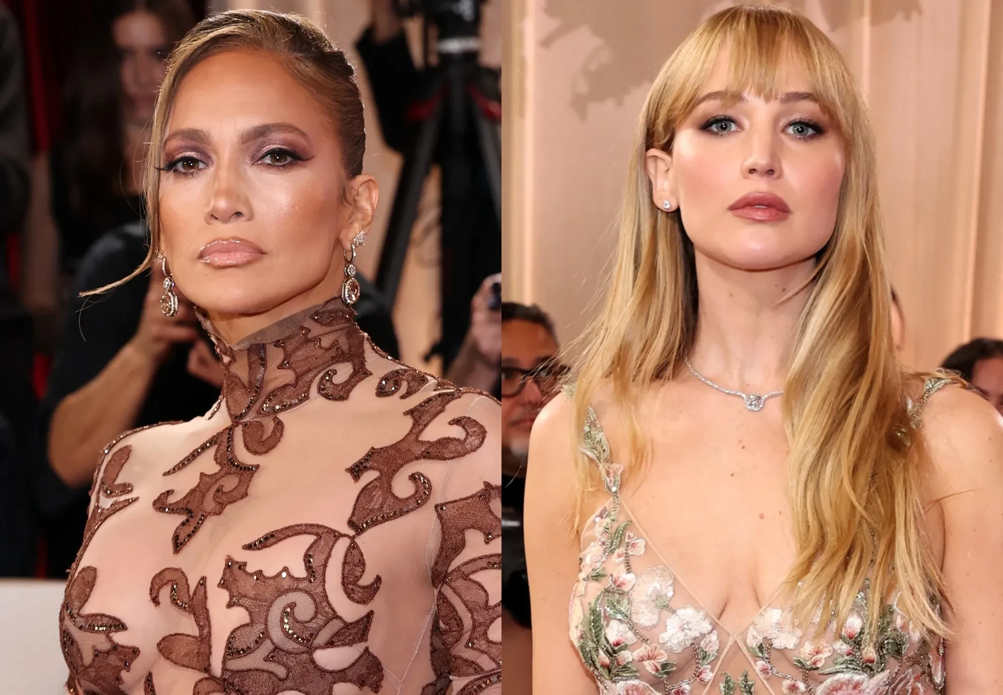 56-летняя Дженнифер Лопес появилась перед фотографами в наряде Jean Louis Scherrer с расклёшенной юбкой, дополнив образ высокой причёской и клатчем со стразами. 35-летняя Дженнифер Лоуренс надела прозрачное платье Givenchy с цветочной вышивкой и декольте.