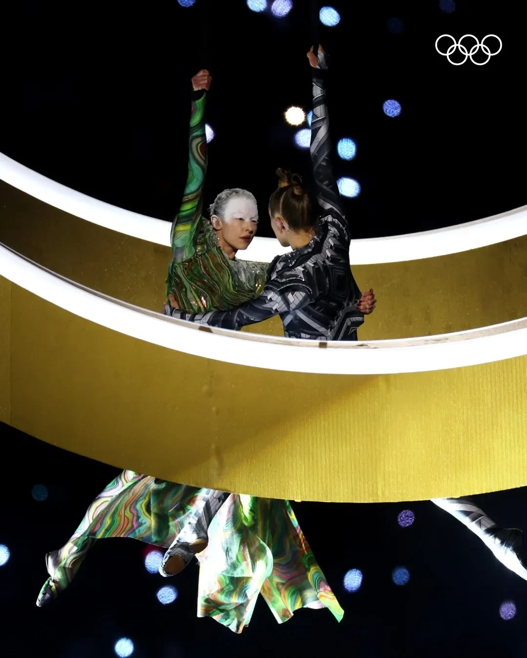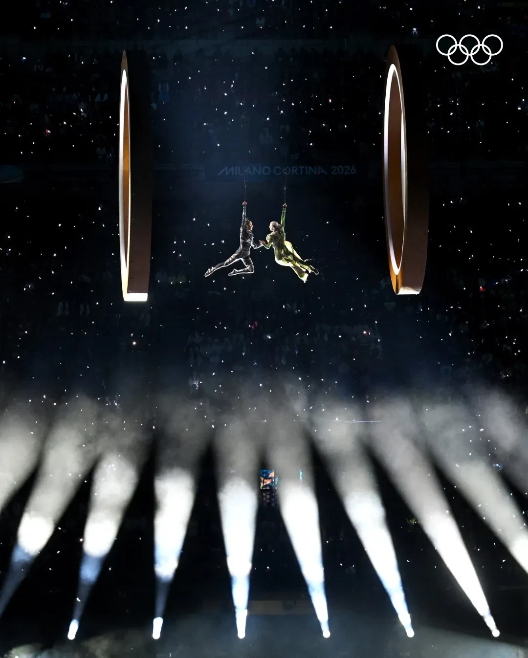 Перед началом парада спортсменов по традиции появились олимпийские кольца. Поднятие знаковой олимпийской эмблемы сопровождали акробаты, исполнявшие трюки на огромной высоте, и грандиозный фейерверк.