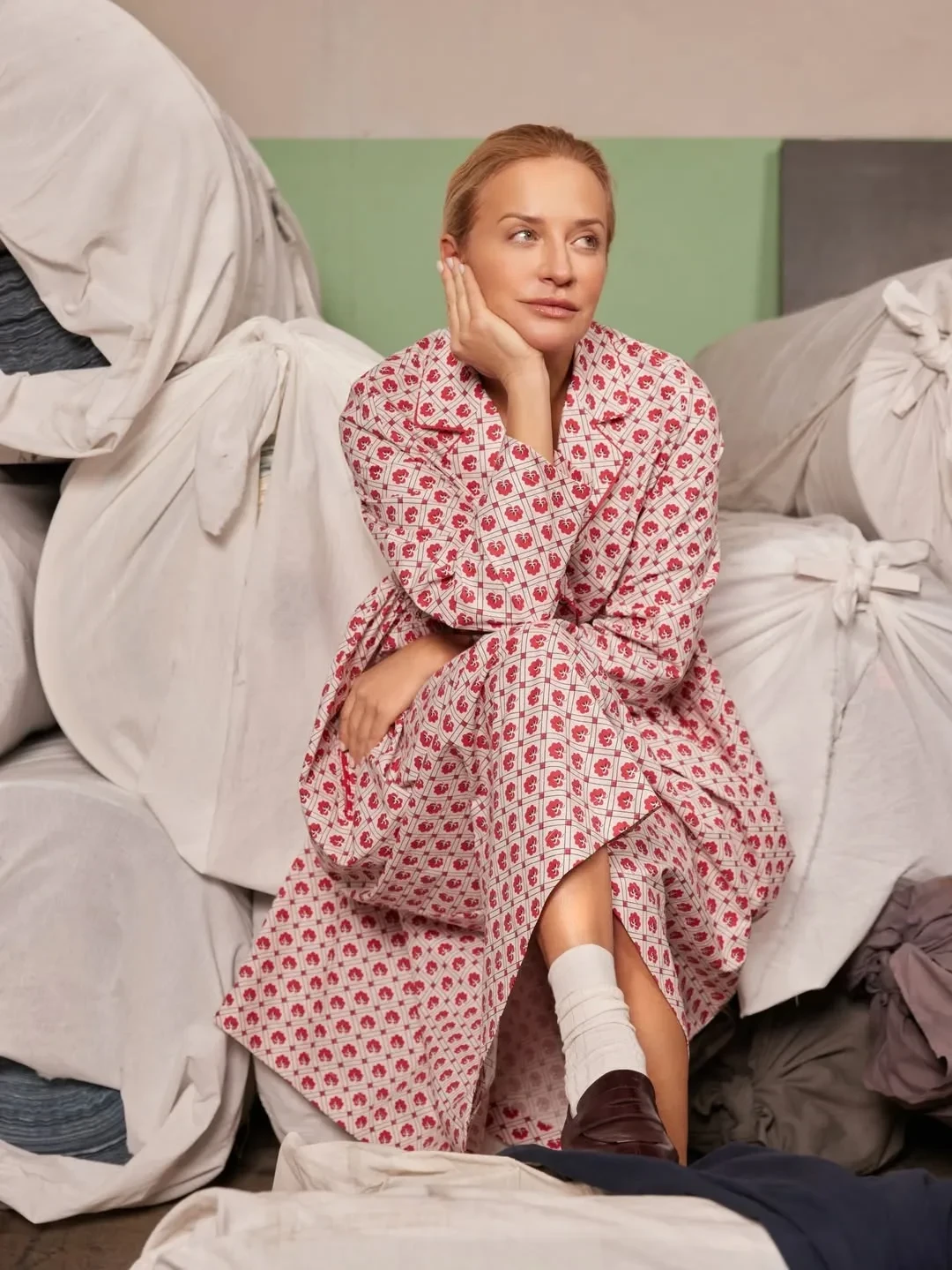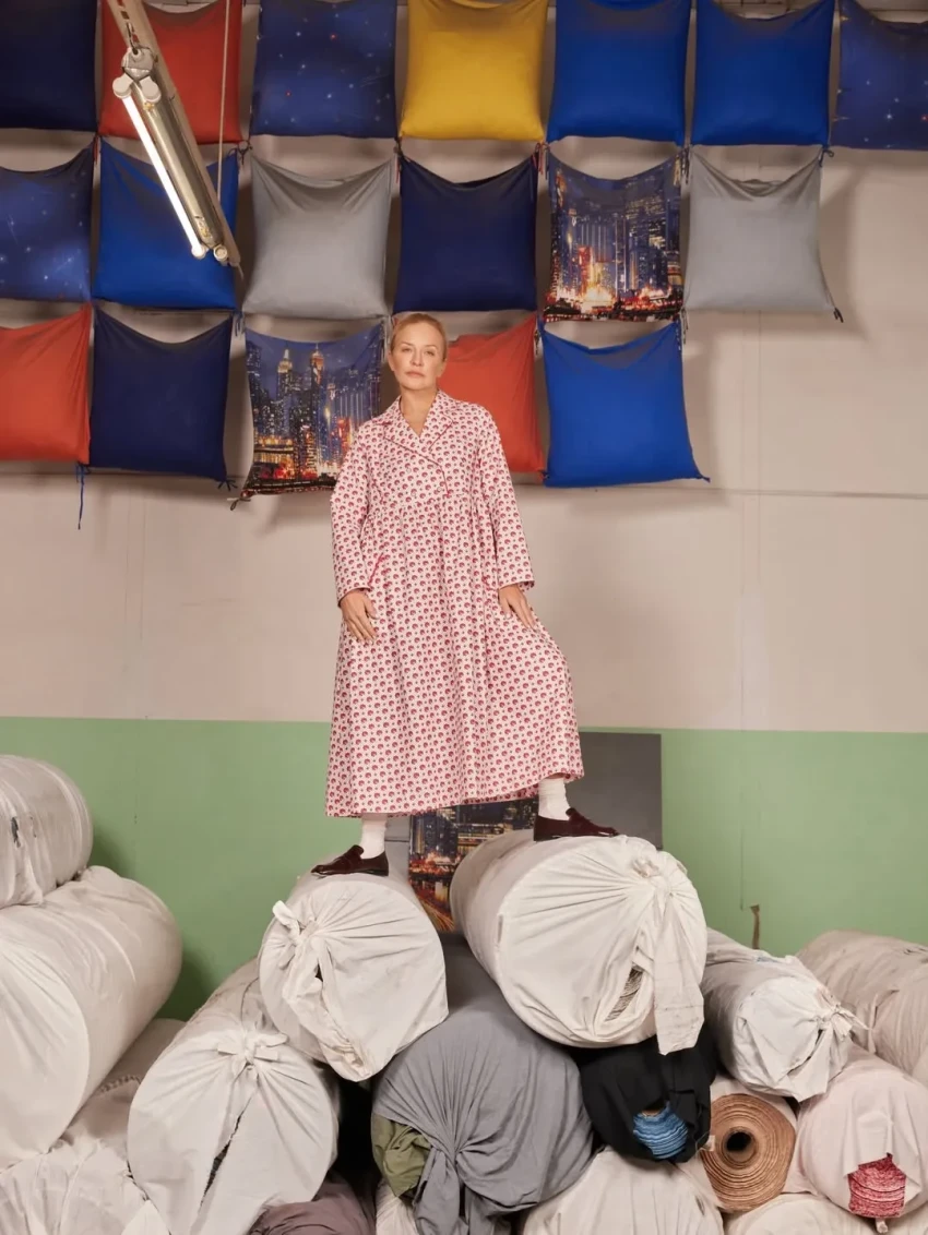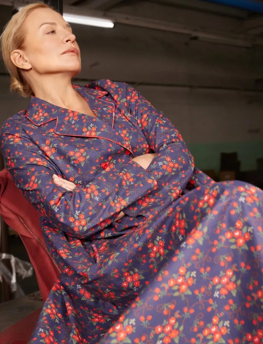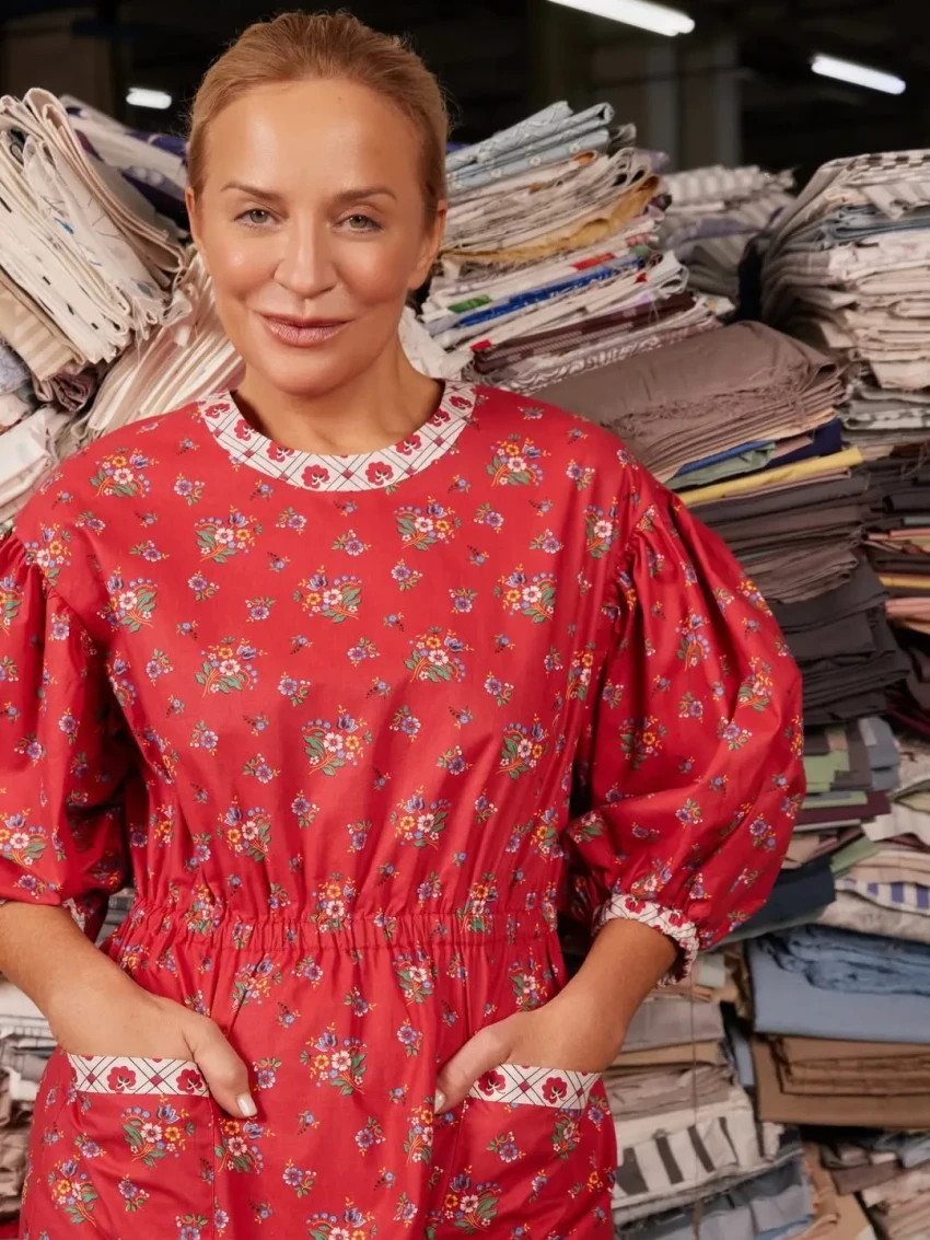 Шелягова примерила фартуки, платья и сарафаны с уникальными принтами, которые были специально отобраны и воссозданы художниками Шуйской фабрики по архивным образцам XVIII—XIX веков и перенесены на современный ситец.