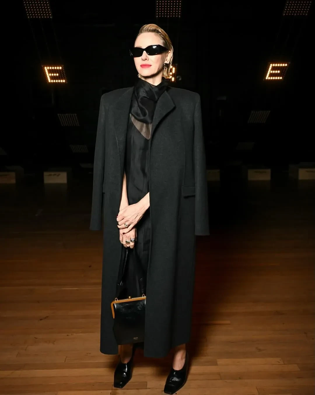 57-летняя актриса появилась на публике в чёрном платье, обнажив грудь, и сером пальто. Образ дополнили солнцезащитные очки и красная помада.