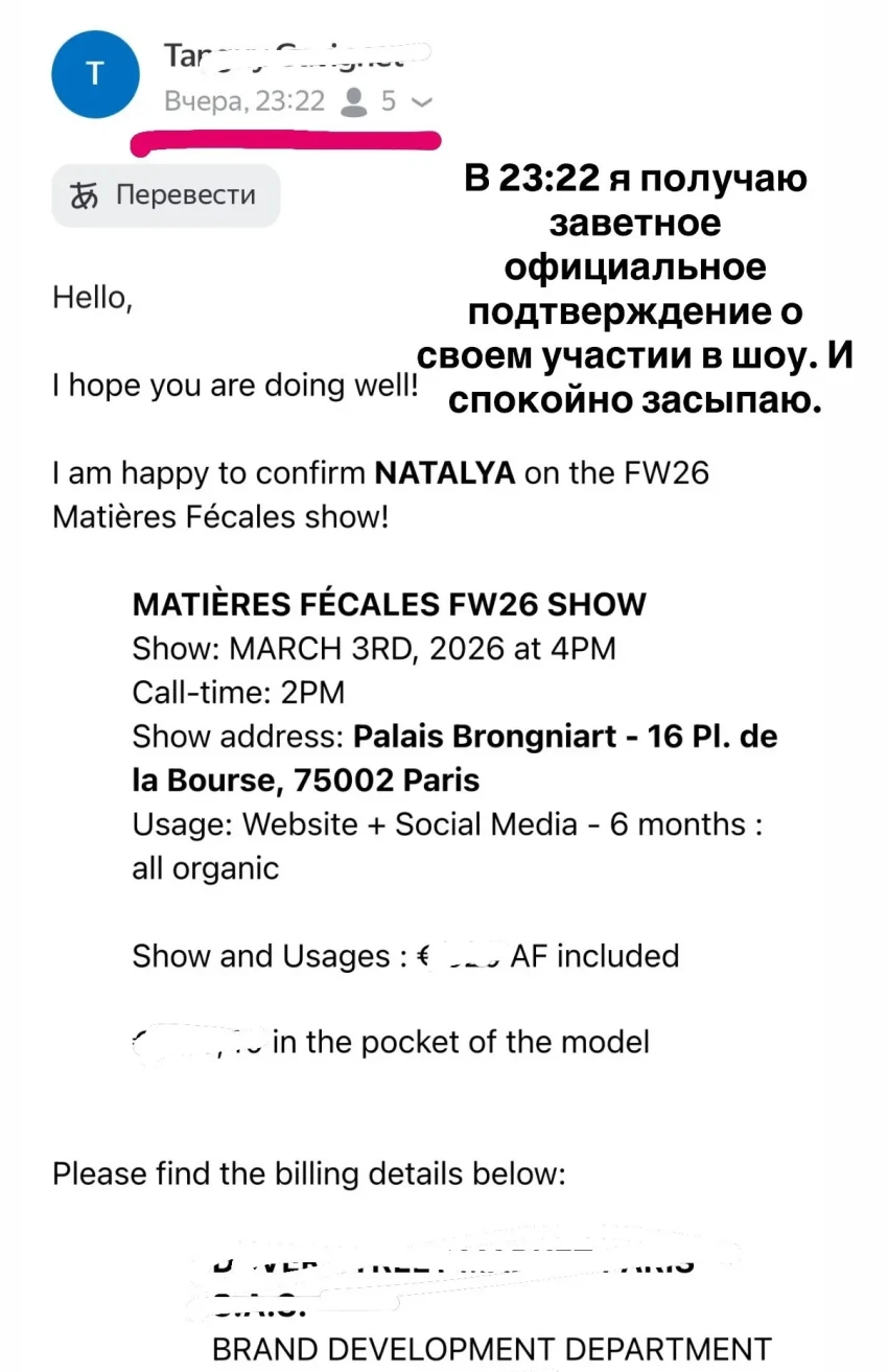 Подтверждение участия Натальи Максимовой в шоуБуквально через 20 минут после письма с подтверждением Наталье приходит сообщение о том, что её участие в шоу аннулировано. Она назвала эту ситуацию "тотальным бредом", потому что якобы вокруг её образа построена идея коллекции о "первертивности буржуазии". Максимова также намекнула, что за наём моделей на показе отвечает тот же человек, который ранее работал в Balenciaga. "Кастинг-директор данного шоу отвечал последние несколько лет за кастинг бренда, в котором всегда ходила она. Да-да, тот самый, который начинается на вторую букву алфавита".