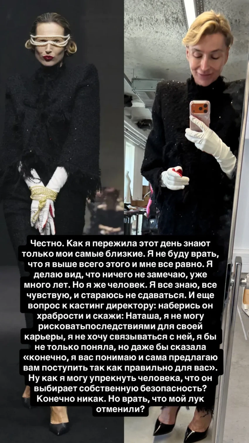 После этого модель и светская львица опубликовала образ Литвиновой с показа и призналась, что этот наряд она надевала на примерке.
