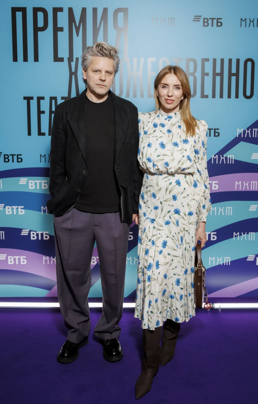 Владимир Хотиненко с женойПремия Художественного театра присуждается молодым деятелям искусств до 35 лет включительно, заявившим о себе в минувшем году. Центральной темой церемонии в этом году стала тема наставников — людей, раскрывающих и направляющих талант молодых дарований.