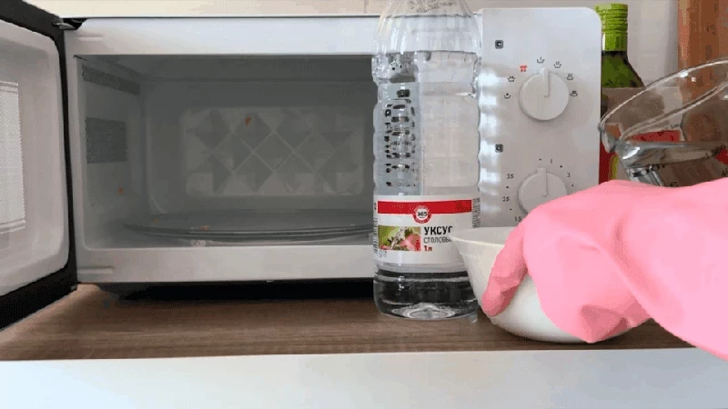 Смешайте воду и белый уксус в равных пропорциях (например, по половине стакана каждого) в миске, подходящей для микроволновки.