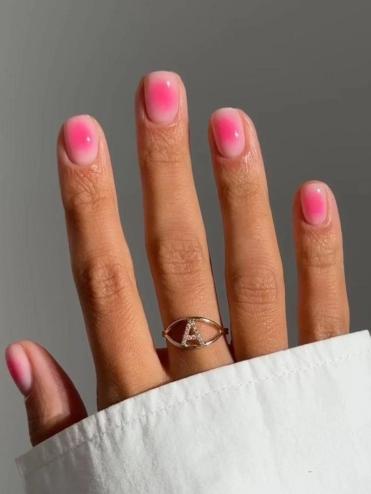 Сделать градиент можно по-разному. Первый способ — внутри одного ногтя: у кутикулы самый светлый, почти молочный розовый, который постепенно становится насыщеннее к свободному краю. Второй — по всей руке: от очень светлого оттенка на большом пальце до более глубокого розового на мизинце.